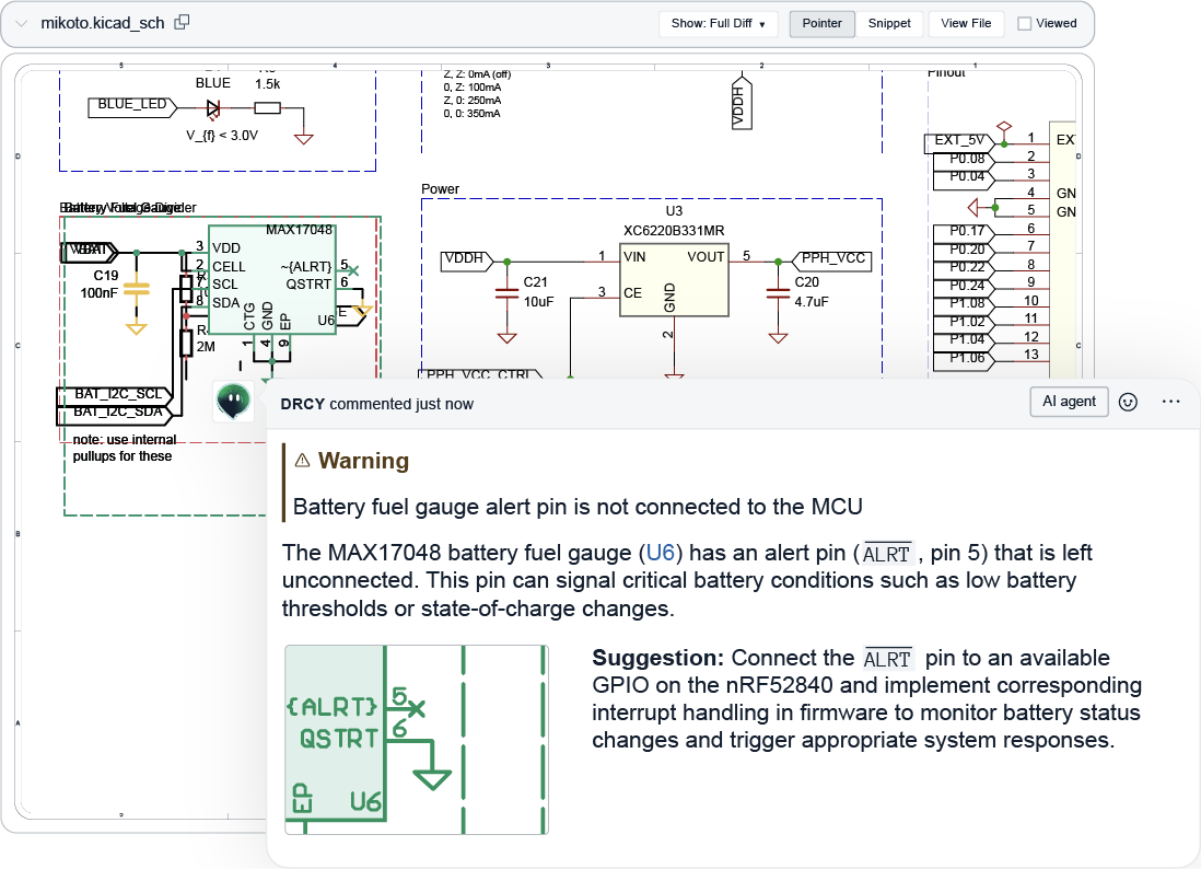 This is where DRCY comes in. DRCY is an AI-powered agent built specifically for hardware design reviews. It parses datasheets at scale and runs first-pass checks for compatibility and fundamental design issues, surfacing potential risks and pointing reviewers to where their attention matters most. Issues surface early, during review, when fixes are still fast and contained.